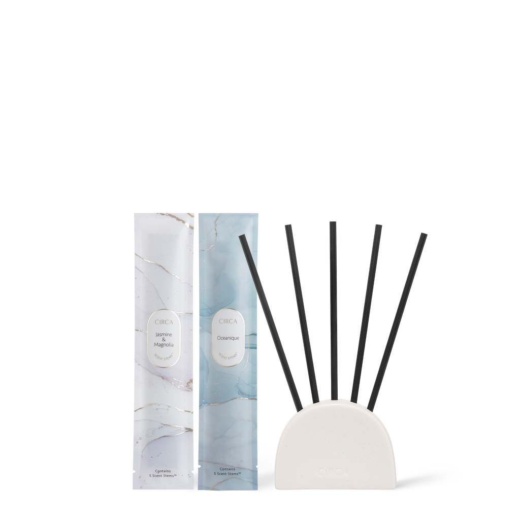 This duo set includes a ceramic holder plus two Scent Stem™ fragrances that use innovative dry diffusion technology: Oceanique and Jasmine & Magnolia