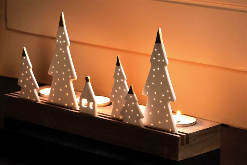 Tealight holder made of untreated acacia wood · features 4 holes for tealight candles, and two pre-cut grooves for inserting porcelain fir trees and a house.