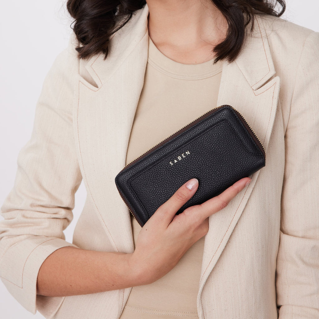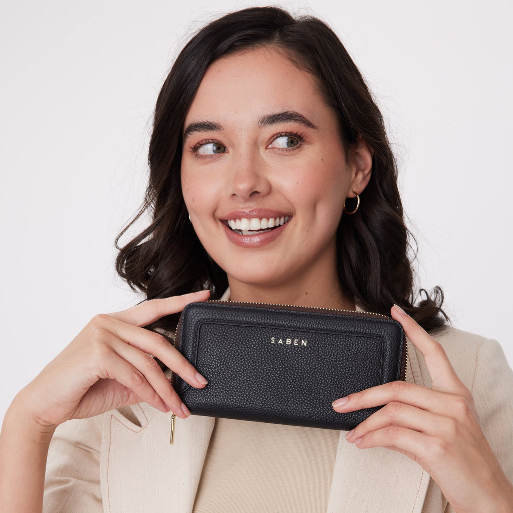 Lyric’s zip mouth allows for easy access, allowing her to be opened flat like a book and makes finding cards a breeze. Front leather frame detailing is the crown on top of this future classic.